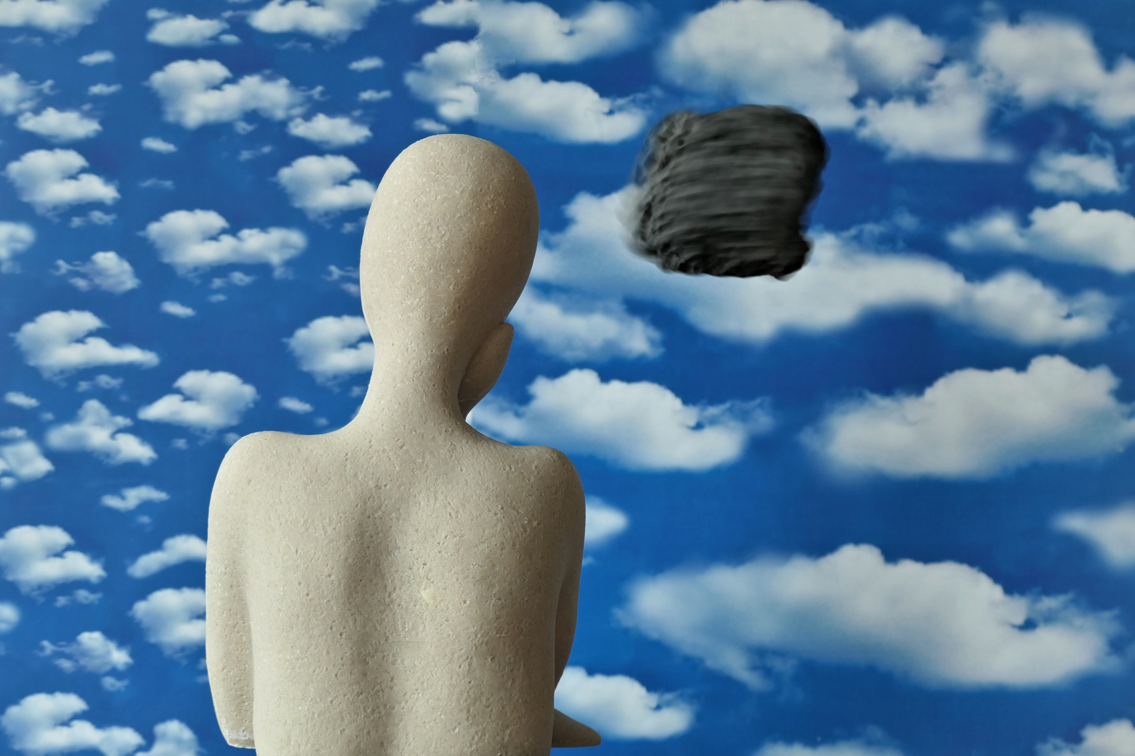 We zien een figuur die peinzend kijkt naar een soort vage, modderige vlek die in de lucht lijkt te zweven. Die past op het eerste gezicht totaal niet in de foto, maar dit versterkt het surrealistische effect alleen maar. Want kijken we hier met de hoofdpersoon misschien naar de onbestemde toekomst? Ik moest ook denken aan de film Nope (Jordan Peele), hoewel die veel duisterder is.